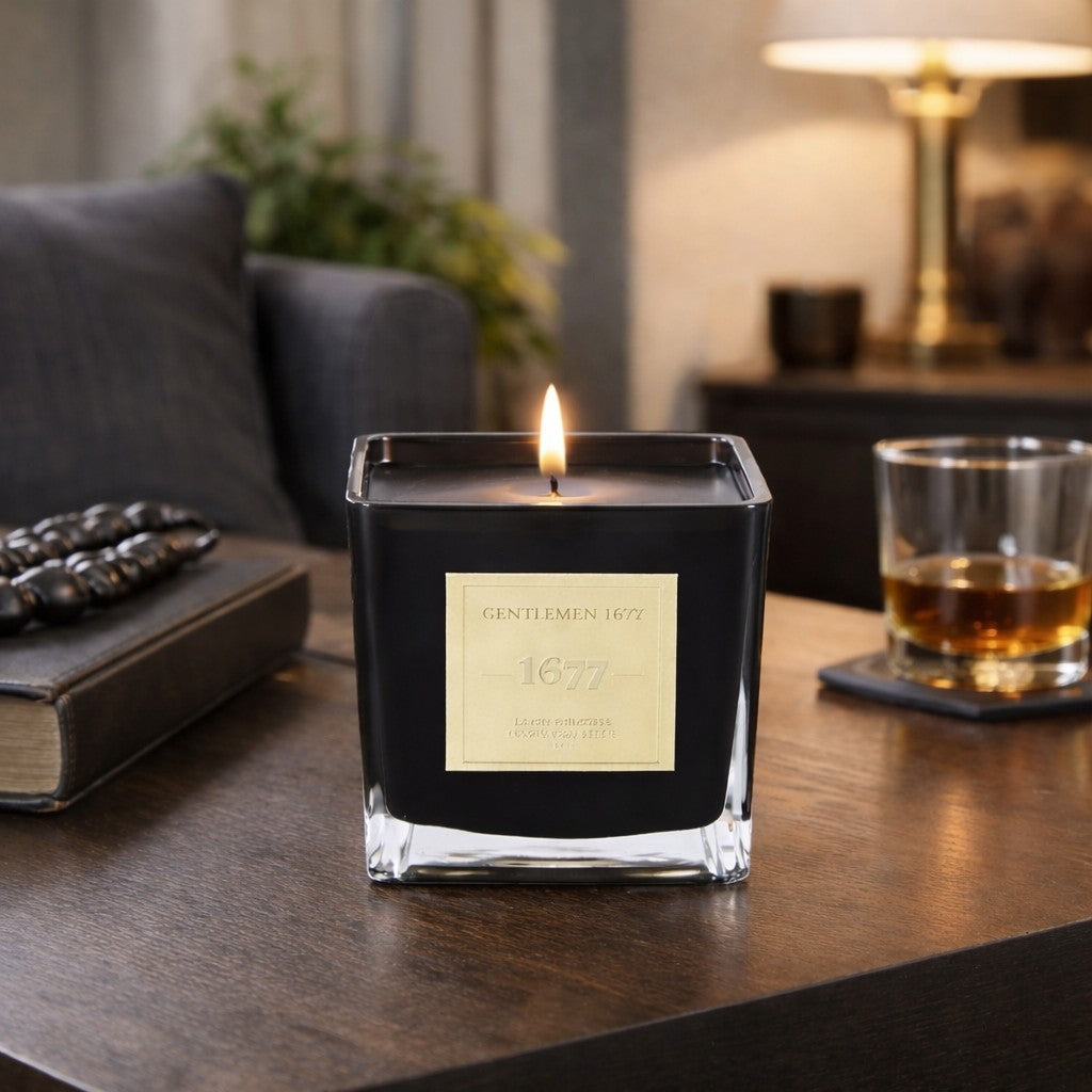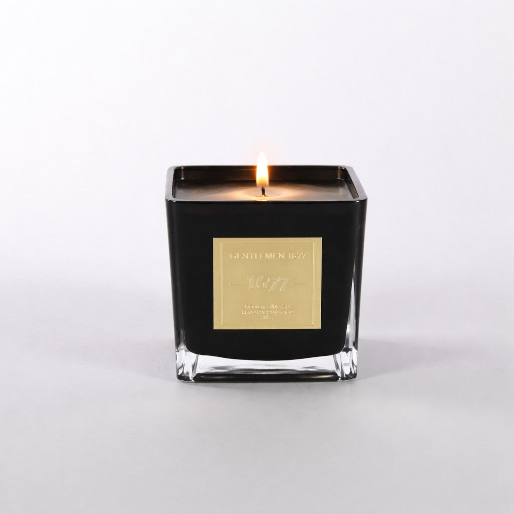 The Gentlemen 1677 scented candle encased in a striking black square glass vessel, delivering modern sophistication and a refined ambient glow to any setting.  Its clean lines complement both classic and contemporary interiors with understated confidence. Each candle is hand-poured on site to ensure the Gentlemen 1677 fragrance performs, from first light to the final flicker, offering a rich, enduring scent experience.
